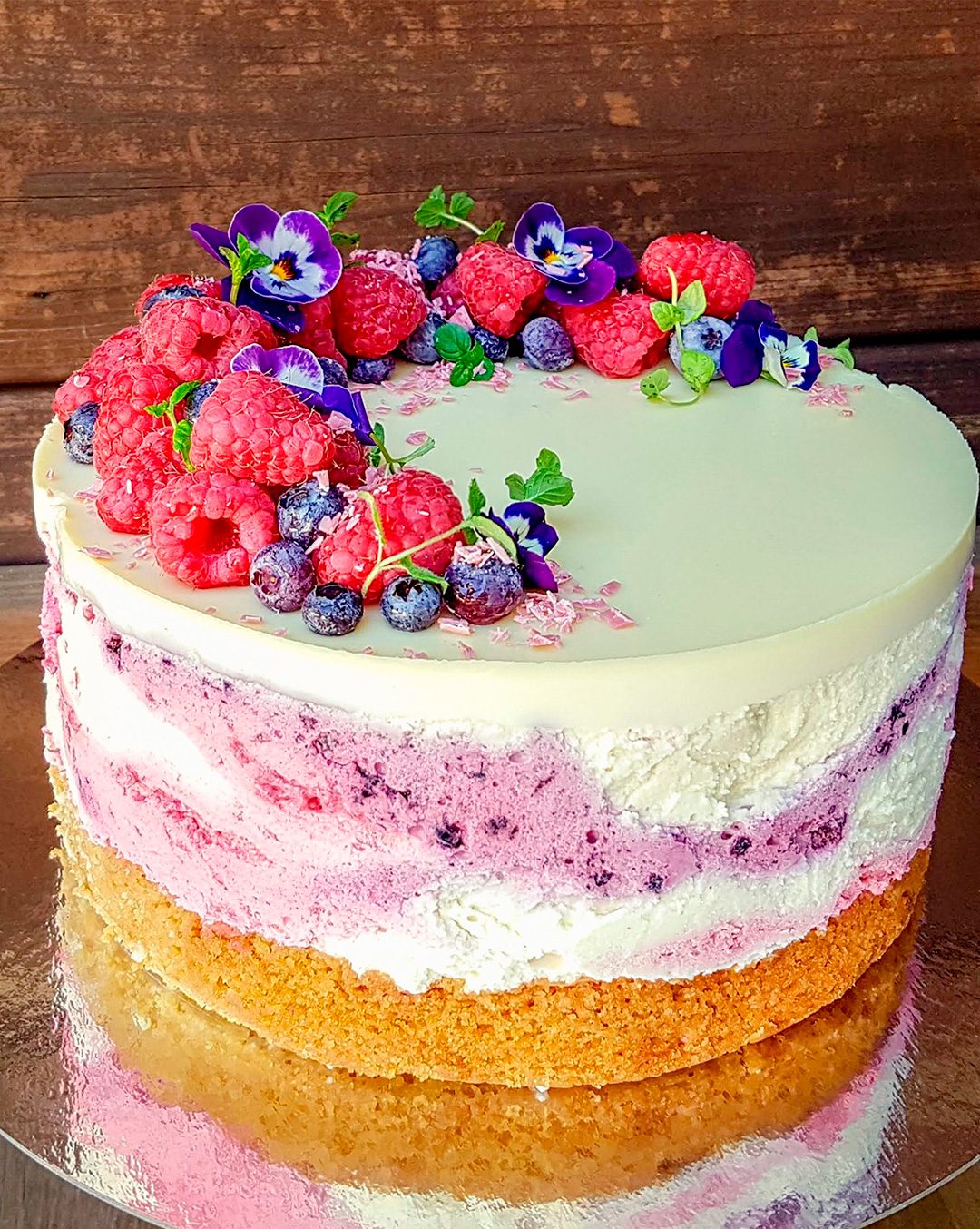 Tässä kakussa yhdistyy marjojen, sekä valkosuklaan makeus. Kakun täytteet ovat hempeän värisiä ja ne saavatkin jäädä näkyviin. Koristeena käytettävät marjat korostavat kakun värejä ja kutsuvat herkuttelemaan.